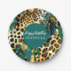 Safari-inspired paper plates featuring animal fur patterns, rich dark green palm motifs, and accents of brown spots and black patches – perfect for special WILD parties.