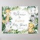 Sweet and bold safari animals baby shower welcome sign featuring five jungle animals and some foliage or greenery. This safari baby shower welcome sign is a sweet way to greet guests at your safari themed baby shower.