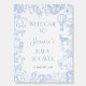 Elegant Blue Toile de Jouy Floral Baby Shower Welcome Poster Foam Boards, featuring a charming safari animal theme. This beautifully designed welcome sign showcases a hot air balloon along with adorable safari animals like a giraffe, elephant, zebra, and lion, all set against a blue floral chinoiserie background. With its vintage aesthetic and graceful typography, this invitation sets the tone for a timeless celebration. Fully customizable to match your event details, it's the perfect choice for a boy's safari-themed baby shower, blending charm and sophistication.