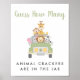 Cute game sign for your baby shower with "Guess How Many Animal Crackers Are In The Jar" written in a mix of a fun jungle green script and simple grey typography and a watercolor illustration of baby zoo animals (lion, elephant, zebra, monkey and giraffe) piled into a safari vehicle. Place a jar or bottle filled with animal crackers underneath and ask your guests to guess how many are in the jar. The winner will be the guest who gets closest without going over. Matching guess cards are available in our Cute Animal Safari Baby Shower Collection.