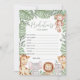 A safari-themed baby shower prediction card featuring watercolor jungle animals and tropical greenery. Guests can fill in their guesses about the baby’s arrival and features, adding a fun and memorable activity to the celebration. Perfect for Wild One, jungle, or gender-neutral baby shower themes and coordinated party stationery.