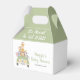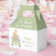 Cute baby shower thank you favor box featuring a watercolor illustration of baby animals (lion, zebra, elephant, giraffe and monkey) piled into a safari vehicle and "Thank You So Much," "It's About To Get Wild" the mother's name in jungle green script.