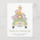 Cute drive by baby shower thank you post card featuring a cute illustration of baby animals (lion, zebra, elephant, giraffe and monkey) piled into a safari vehicle and "Thanks For Driving By" in coordinating army green script. You can personalize your thank you message on the back. Perfect for drive by baby showers.
