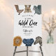 Cute safari theme baby shower welcome sign featuring illustration of zoo animals (lion, elephant, rhino, snow leopard, zebra, and giraffe). The text says "a little wild one is on the way."