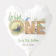 The word ONE is from wood letters. Inside the o there is a round placeholder photo of a boy. around the other wood letters there are animals and palm leaves: parrots on the N and E, a giraffe in front of the N, a zebra between the letters and a monkey in the lower half of the E. Above the O, there is the word Wild written in a green handwriting. In the same green handwriting there is the occasion , under the image, with the date under it, in gray. The default name is Liam.