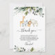 Cute safari themed gender neutral baby shower thank you card featuring a grey, green and gold foliage arrangement at the top and base of the design as well as four cute safari or jungle animals.