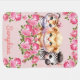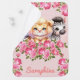 A delightful girl's baby blanket featuring a charming combination of jungle safari animals and delicate roses, personalized with a custom name, creates a whimsical and unique touch. Imagine a soft, pastel print blanket adorned with cute illustrations of a gentle zebra, a friendly lion and a sweet tiger cub, with delicate roses in various shades of pink, adding a touch of sweetness and femininity to the design.