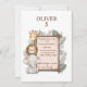 This safari jungle birthday invitation is perfect for a boy’s 5th birthday party or any kids’ safari-themed celebration. The design features a calm pastel jungle scene with friendly elephants, monkeys and palm trees in muted greens, beige and grey tones.