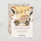 Looking for the perfect card to thank your guests for coming to your little one's birthday party? Look no further than our adorable safari-themed thank you cards, featuring a safari truck filled with all kinds of safari animals, including a lion driving the truck, a leopard, a meerkat, a giraffe, an elephant, and a zebra. The thank you card also features a huge sun in the background and tropical leaves in earthy safari tones of neutral beige and brown.