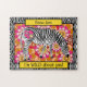 Sweet safari style puzzle game. The zebra is wearing a heart on it's hind quarters that says "LOVE" and is grazing among a field of mod pink and yellow flowers. The remainder of the jazzy background consists of fun psychedelic zebra stripes. The floral art is goldenrod, sunshine yellow, blush pink, and cheerful bright fuchsia. There is a name template above the cute zebra and another below. The bottom text reads: I'm WILD about you! The text is easily changed to your liking. Surprise your Valentine sweetheart with this wonderfully unique and colorful novelty gift.