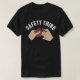 My 11 yo wore adult XL (5’7” 165#). The 8yo is small framed. She wore adult small and tied it in the back. Grandma wore adult large with long sleeve shirt underneath. Tall girl adult medium. Dark haired male adult large. Good quality dark Heather gray, Gildan brand shirt. -it was next up from basic choice and cost about $20 per shirt. Not too thick or thin. Washed and dried well, no major shrinkage. Not see-through. Can wear a bra under it fine. Screen print is just as shown and well done, front and back.