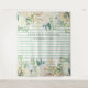 This stunning wedding photobooth backdrop features trendy watercolor flowers in shades of ivory, white, peach, and gold, with green leaves, on a sage green and white striped background.