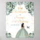 This elegant and glamorous birthday party welcome sign features a beautiful princess with dark skin in a sage green ball gown. The text combines handwritten script and modern sans serif fonts for a classy and sophisticated look. The floral arrangements, butterfly and gold confetti create the perfect blend of rustic and chic.
