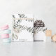 A sage green eucalyptus with blush rose and white flowers wedding wrapping paper featuring the words, "Congratulations," and the bride and groom's names with their numeric wedding date written on this wrapping paper.