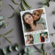 Double sided save the date card with three photos in a modern, minimalist collage on one side and a larger photo on the other. Add your wedding details in white against a sage green background. The photo save the date features a white border.