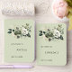 These elegant bride and groom wedding vow booklets feature a soft sage green background adorned with a delicate botanical floral arrangement of white blossoms and muted greenery, creating a timeless and romantic aesthetic. The design is complemented by a graceful mix of classic serif and flowing script typography, giving each booklet a refined, personalized touch while keeping the layout clean and balanced. Perfect for modern, garden, or rustic weddings, these vow books offer a beautiful and meaningful way to hold your heartfelt promises, serving as a cherished keepsake for years to come.