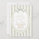 Featuring watercolor sage stripes, a leafy oval frame, and a delicate ribbon bow, this design is calm, minimalist, and beautifully gender-neutral.