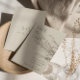 The matter paper is our sample of choice -- it's a reasonably priced, good quality, nice feeling paper stock. We were a little concerned the muted rustic blues might not reproduce all that well (usually by light colored samples), but they're just gorgeous! The white lettering is perfect in combination with the blue background, and the typography is all easy to read.