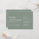 Plain white envelopes are included with paper invitations and will come to fit the invitation size you select. If you don’t need the envelopes, you may choose to not receive them by selecting the dropdown below "Envelopes" and choosing "None." If you’d like to have a design on your envelopes, you can browse all of these available envelopes to find the design that complements your Minimal Chic Handwritten Sage Green Wedding Invitation.