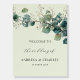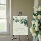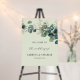 An elegant sage green eucalyptus wedding welcome sign featuring boho watercolor greenery and corner botanical designs for all seasons.