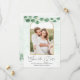 This modern and elegant wedding save the date card is perfect for the contemporary couple. It features sage green hand-painted hanging eucalyptus garland on top of a faux printed gold oval frame for the couple's photo and light green watercolor artsy background. It's artistic, beautiful, and rustic; the perfect design to impress your guests.