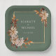 Sage Green Fall Paper Plate. Serve up style with these paper plates decorated in a stunning floral and leaf motif in classic fall tones. Burnt orange leaves, beige dahlias, and rust-colored roses rest against a soft sage green background, creating a tablescape that’s as beautiful as it is practical. Make every bite part of your autumn vision—customize your set now.