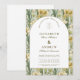 A sophisticated botanical design featuring rich green foliage and soft ivory blooms, framed within a timeless arched layout. The deep, nature-inspired tones bring a sense of depth and refinement, while the clean typography keeps the overall look elevated and effortless.