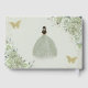 Cherish your special day for the years to come with a customized guest book. Featuring a quince girl in a sage green gown, pretty sage green roses and green and gold butterflies. Personalize it with your details easily and quickly, simply press the customise it button to further re-arrange and format the style and placement of the text. (c) The Happy Cat Studio