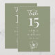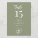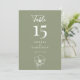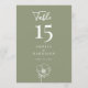 This Sage Green Elegant Floral Wedding Reception 5x7 Table Number showcases a large table number in white on a sage green background, with modern typography and script calligraphy, and a line art floral accent. It is fully customizable with the table number, couple's names, and wedding date.
