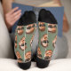 Funny custom face crew socks personalized with a photo and a sage green background. Upload a cutout of the face with a transparent background and it will automatically be replicated all over the socks, on both sides. To make the cut-out, you can download any mobile or computer app, or use the program named Canva or Photoshop.