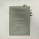 Crisp white typography combined with subtle gold foil accents brings a luxurious touch to this invitation, making it ideal for garden weddings, outdoor ceremonies, or classic celebrations. This sage green and gold wedding invitation beautifully reflects a refined style that’s both simple and sophisticated.