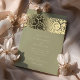 This stunning wedding invitation features a luxurious combination of sage green and gold foil accents, creating an elegant and sophisticated look. The front of the card is adorned with a rich, ornate floral design in shimmering gold, set against a tranquil sage green background. The back continues the floral motif with a subtle, artistic pattern and personalized initials. This invitation is perfect for couples seeking a refined and modern design with a touch of vintage elegance. The color palette of sage, olive, and gold makes it an ideal choice for nature-inspired or upscale weddings.