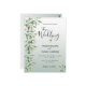 On front: Botanical theme. Sage green gradient, ombre background. Decorated with greenery, sprigs and foliage with small golden flowers. Modern large hand lettered script, typography with the text: The wedding of. Templates for Your names and wedding details. Black text.
