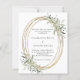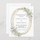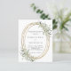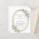 A white background decorated with sage green greenery. A faux gold frame. Personalize and add your names and details.