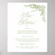 Elegant sage green hydrangea wedding menu sign featuring hand drawn botanical florals and a soft heirloom style. Perfect for bridal showers, luncheons, and wedding receptions. A refined table display piece.