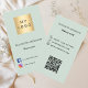 A trendy sage green background. Personalize and add your business logo,name, title and contact information. Add your website url/link to the Qr code. With Facebook and Instagram icons. Black text.