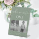 Modern, elegant wedding table number pedestal sign features a minimalist sage green and white design. The table number corresponds to the age of the couple and features black and white photos of them at that age. Personalize with your names and wedding date with the easy to edit template featuring an elegant script font and classy serif font. Create as many table numbers as you need by changing the "one" to your desired number, swapping the photos for your own, and add 1 item to your cart. Repeat for as many table numbers needed.