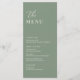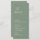 Modern, elegant menu features a minimalist sage green and white design with modern lines. Personalize with your event's menu with the easy to edit template featuring an elegant script font and classy serif font.
