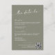 Introducing the Modern Sage Green Script Wedding Details Enclosure Card! This beautiful card is perfect for adding a personal touch to your wedding invitation suite. The simple modern design features sage green text on a white background, with stylish handwriting calligraphy for the title. On the reverse side, you’ll find a solid sage green color. Use this enclosure card to share essential wedding details, such as reception time, location, accommodation arrangements, and your wedding website URL. It’s an elegant addition that ensures your guests have all the information they need for your special day.