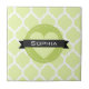 Chic Moroccan lattice pattern in a light sage green color with a green and grey nameplate label with heart for you to easily personalize your name on. A cute trendy quatrefoil pattern design that would make a cool personalized gift for her birthday, Valentine's Day, Christmas or graduation gifts.
