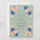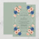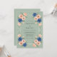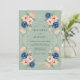 This botanical design features a muted sage green backdrop adorned with lush watercolor blooms. Deep navy blue anemones contrast beautifully with soft peach roses and delicate leafy greenery. The arrangement creates a serene and romantic atmosphere, perfect for a graceful spring or summer event.