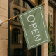 Delicate Soft Sage Green Minimalist Modern Open Sign Small Business Double-Sided Flag — Simple muted sage green pastel-tone colored minimalist weatherproof flag with clean white colored text in a clean and modern sans serif typeface for your small business, shop, boutique, bakery, bistro, restaurant, coffee shop, dispensary, market, thrift store, massage parlor, dog grooming or pet daycare facility, hair or nail salon, or anything else that needs an eye catching boost to let potential customers know they're welcome to come on in.