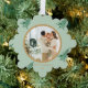 Celebrate the holiday season with elegance using our Sage Green Pagoda Merry Christmas Tree 2-Photo Ornament. This ornament features the words "Merry Christmas" on our signature Sage Green Christmas tree pattern, with space for a customizable photo on the front. The back includes another customizable photo and the phrase "Wishing you a very merry Christmas." Personalize both sides by replacing the photos, name, and date to create a meaningful keepsake. Be sure to explore our matching ornaments and items in the Chinoiserie Pagoda Christmas Collection for a complete festive look.