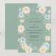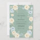 This design features a serene sage green backdrop adorned with a lush border of creamy white roses and dusty blue blossoms. Delicate watercolor greenery and soft white accents create a romantic, botanical atmosphere perfect for a seasonal event. The painterly style evokes a sense of timeless elegance and natural beauty.