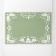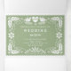 Sage green and white papel picado love birds tri-fold wedding fiesta invitation. This nature inspired Mexican folk art style floral wedding invite includes two love birds and a love heart with the word love as well as flowers, leaves and small dots in white on sage green background.