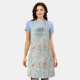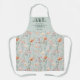 A boho style apron. A sage green background. Decorated with watercolored flowers in coral, pink and peach. Personalize and add your name and a text. Kitchen utensils framing the name.