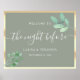 Elegant rehearsal dinner welcome sign in soft sage green with watercolor eucalyptus leaves and faux gold border. A refined and modern botanical design perfect for welcoming guests the night before your wedding. Personalize with your names and date.