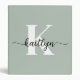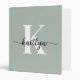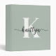 This simple, elegant sage green 1" capacity 3 ring binder with your first name in a trendy script font in black and your first initial in a modern cap font in white is perfect for keeping your recipes, photos, papers neat and tidy. It's stylish and trendy and yet very classic.