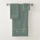 A beautiful sage green design incorporating signature script font typography. A classy and stylish bathroom towel set design ideal for anyone. Customize the gold monogram text and script typography bathroom towel set and make it your own!