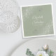 These beautiful napkins will make your wedding reception something special. They feature a simple yet elegant design with pale Gray text on a sage green background with a lacy silver faux foil curls and swirls in the corners. Easily personalize with your names and the wedding date.